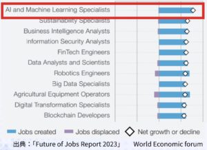 世界経済フォーラム『Future of Jobs 2023』では、AI関連職が急成長職種で第1位、企業のスキル研修の優先事項で第3位、重要スキルでも第7位と示されました。今後、ますますAIは急成長し、学習や仕事でもAIスキルを必要とされていきます。AI操作の練習だけでなく、AIと協働して課題を解くスキルを求められる時代になっていきます。